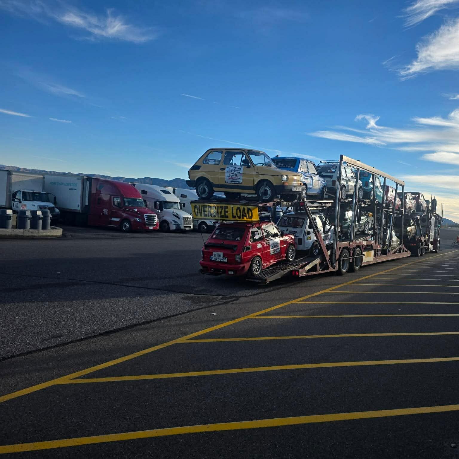 Getting 14 tiny Maluchy to Las Vegas from Chicago was an adventure in itself β the cars were transported on a massive car hauler truck marked 'OVERSIZE LOAD.' The irony of calling a load of the world's smallest cars 'oversize' was not lost on anyone!